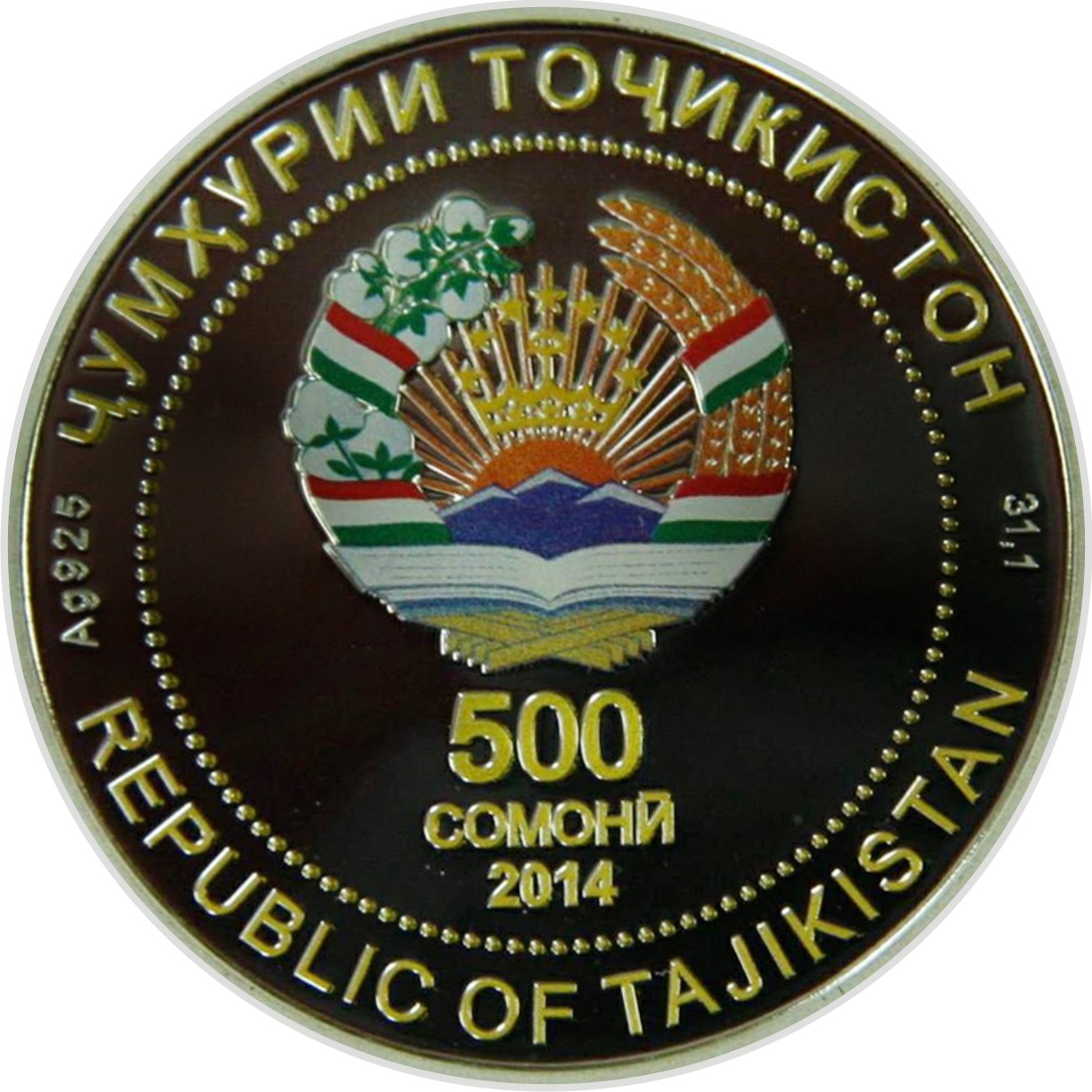 Аверс (лицевая сторона): В верхней части внешнего кольца надпись на таджикском языке: «Чумхурии Точикистон» и в нижней части на английском языке. Между этими надписями с левой стороны указаны качество и проба металла «Ag 925» и с правой стороны ее масса (31,1). В центре диска указаны цветной Национальный герб Таджикистана, под ним номинал монеты – «500 сомонӣ”, а ниже номинала цифра 2014 год, что обозначает год выпуска монеты.