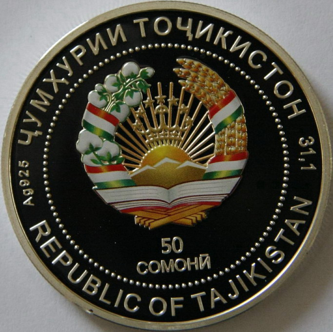 Аверс (лицевая сторона): по диаметру внешнего кольца надпись на таджикском и английском языках: «Чумхурии Точикистон», также указана масса (31,1) и проба металла (Ag 925) соответственно. В центре диска указан Национальный герб Таджикистана на цветном фоне, под ним номинал монеты – «50 сомонӣ”.