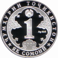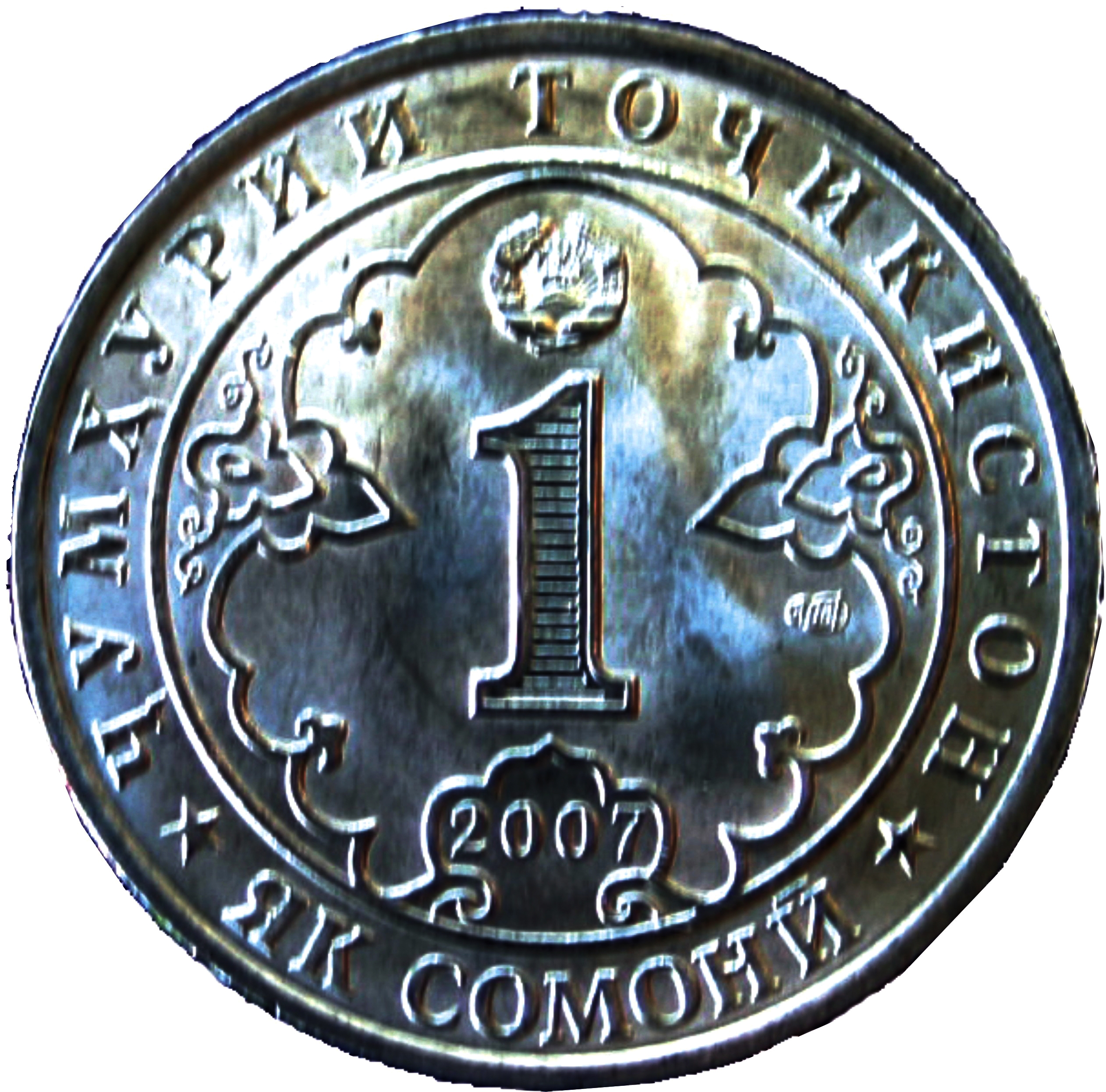 Аверс (лицевая сторона): по диаметру внешнего кольца надпись: «Як сомони» (один сомони). В центре диска цифра «1» (достоинство), вверху Государственный герб Республики Таджикистан, внизу указан год чеканки -2007.