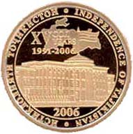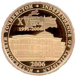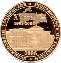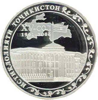 Реверс: по диаметру внешнего кольца слева надпись на таджикском языке: «Истиклолияти Точикистон» («Независимость Таджикистана»), справа элементы национального узора. Во внутреннем круге изображение здания Дворца Нации, на куполе которого водружен Государственный флаг Республики Таджикистан. Над флагом слева на фоне карты Таджикистана надпись: «Х V -сол, 1991-2006».