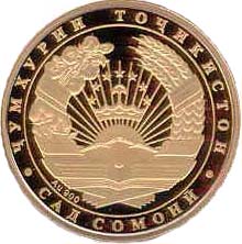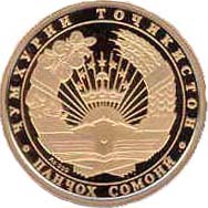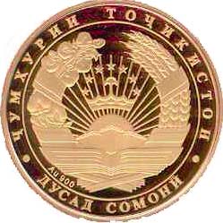 Аверс: В центре диска расположено цветное изображение Государственного Герба Таджикистана и под ним