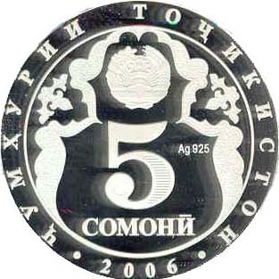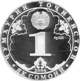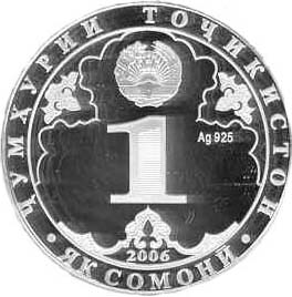 Аверс: по диаметру внешнего кольца надпись на таджикском языке: «Чумхурии Точикистон» (Республика Таджикистан). Под кольцом год чеканки–2006.