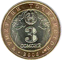 Аверс: по диаметру внешнего кольца надпись на таджикском языке: «Як сомонии» («Один сомони»). В центре диска цифра 1 (достоинство), вверху Государственный герб Республики Таджикистан, внизу год чеканки- 2006.