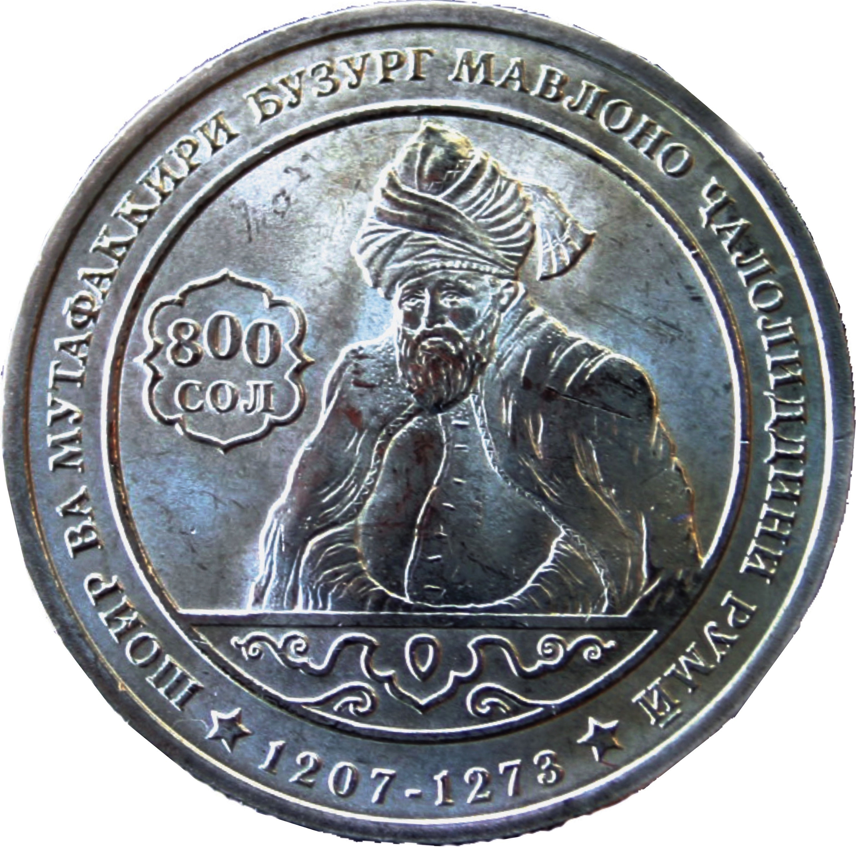 Реверс (оборотная сторона): по диаметру внешнего кольца надпись: «Шоир ва мутафаккири бузург Мавлоно Чалолиддини Руми» («Великий поэт и мыслитель Мавлоно Джалолиддин Руми»), в нижней части внешнего кольца годы жизни поэта «1207-1273», посредине портрет поэта, слева надпись: «800 сол», внизу кольца элементы национального узора.