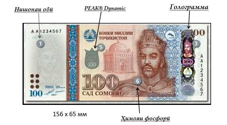 1.Нишонаи обӣ Тасвири расми шахси дар рӯи пул буда, дар қисмати сафедии тарафи чапи пул, дар таркиби коғаз такрор ёфта, дар муқобили рӯшноӣ дида мешавад. – бисёртобиша, такрори расми шахси дар рӯи пул буда дар қисмати сафедии тарафи чапи пул. |