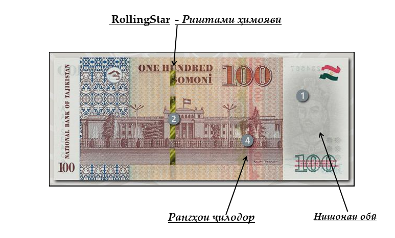 6. Кинеграмма: ҳангоми тағйир додани кунҷи рӯшнои навори амудии филизӣ, тасвири нишони Бонки миллии Тоҷикистон ва матнҳои тоҷикию англисӣ, ки дар рӯи он воқеъ мебошанд, бо рангҳои гуногун медурахшанд.