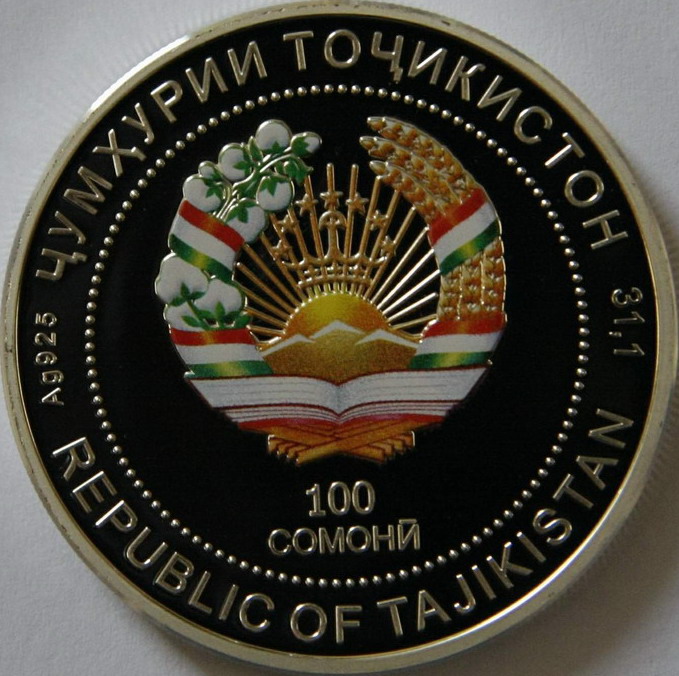 Рӯи танга (Аверс): Дар ҳалқаи берунии қурс навиштаҷоти “Ҷумҳурии Тоҷикистон” бо забонҳои тоҷикӣ ва англисӣакс ёфта, ҳамчунин вазн (31,1) ва иёри филизи (Ag 925) танга нишон дода шудааст. Дар маркази қурс Нишони давлатии Тоҷикистон ва дар зери он арзиши танга, “100 сомонӣ” сабт гардидааст.