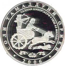 Дар паси танга: дар қутри ҳалқаи берунӣ навиштаҷоти “Соли Тамаддуни Ориёӣ”, дар поён соли барориш – 2006. Дар маркази қурс саҳнаи шикори шоҳ, ки дар аксари ёдгориҳои ориёӣ вомехӯрад.